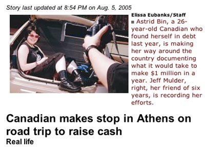 The project was inspired by debt, and a desire to change. "At the end of 2004, I was forty thousand dollars in debt from my education and barely able to keep ahead of debt payments and expenses," remembers Bin. "I didn't see a way out. I decided that I needed to change my life and do something drastic. Something like making a million dollars in a year. I want to change my lives and change the lives of others with this project - if I can prove that I can change my life with only an idea and conviction, what else is possible?"