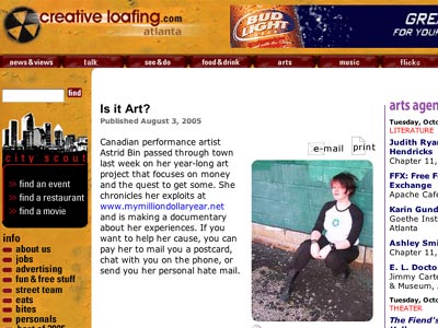 Creative Loafing in Atlanta was looking for someone to kick off their Is It Art? feature the week I was in Athens on My Million Dollar Road Trip. After getting lost in Atlanta where every single street is named Peachtree and they all lead to CNN, I met with them and told them what I was doing. They ran the story the following week.