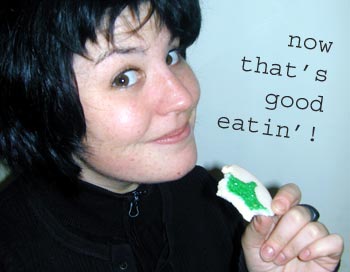 I made cookies. Good ones. Sugar cookies with icing. They're delicious. Here's me enjoying one: